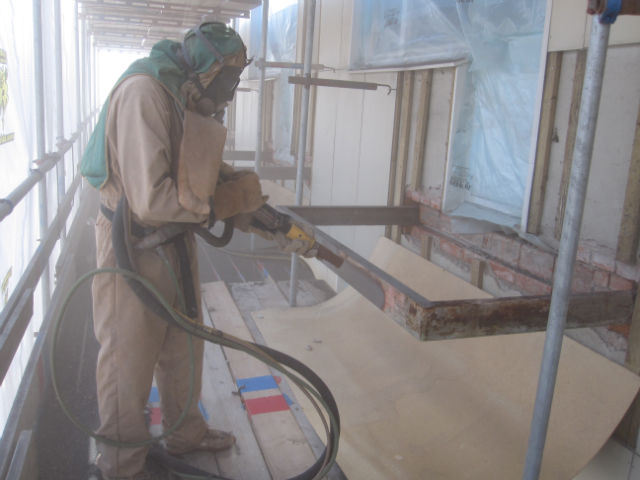 Till vänster: Här har betongen i plattan rivits så att rambalken har frilags. Till höger: Blästring av rambalk, till renhetsgrad Sa 2½.