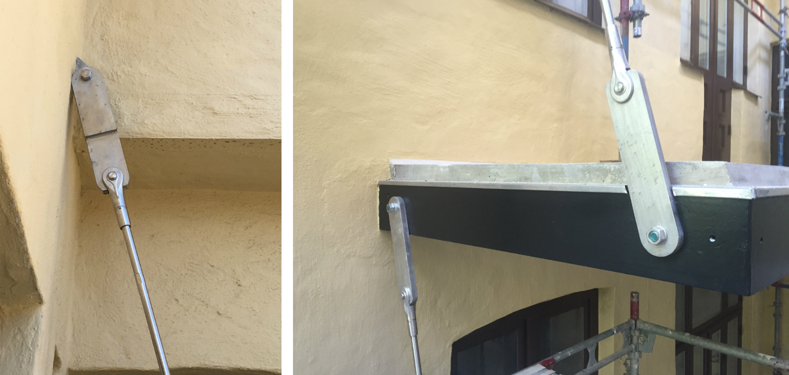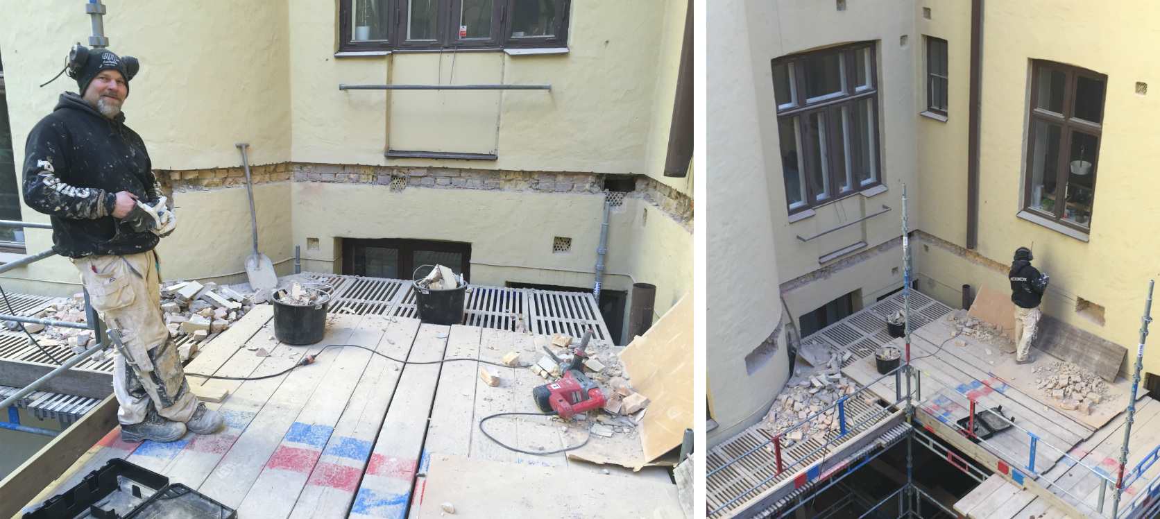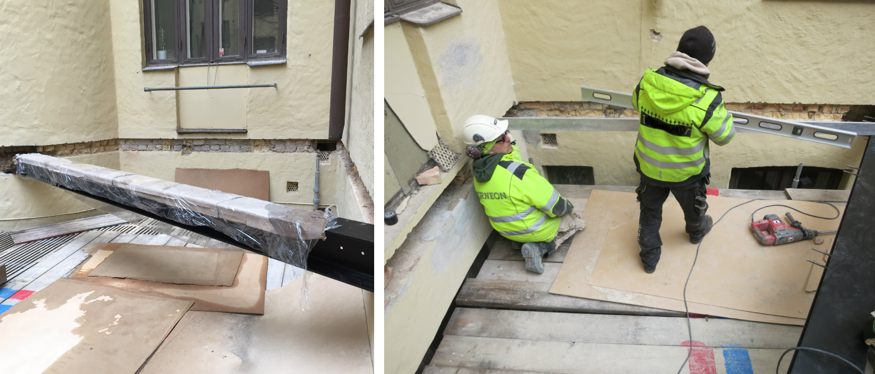 Stöttor sattes upp under balkarna och lodades in.