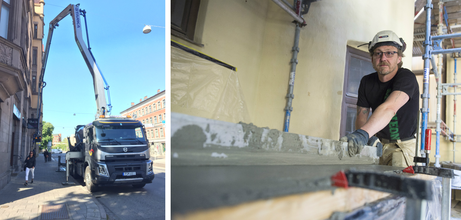 Plattorna göts med fabriksblandad betong. Plattorna stockades och filtades för att få rätt finish.