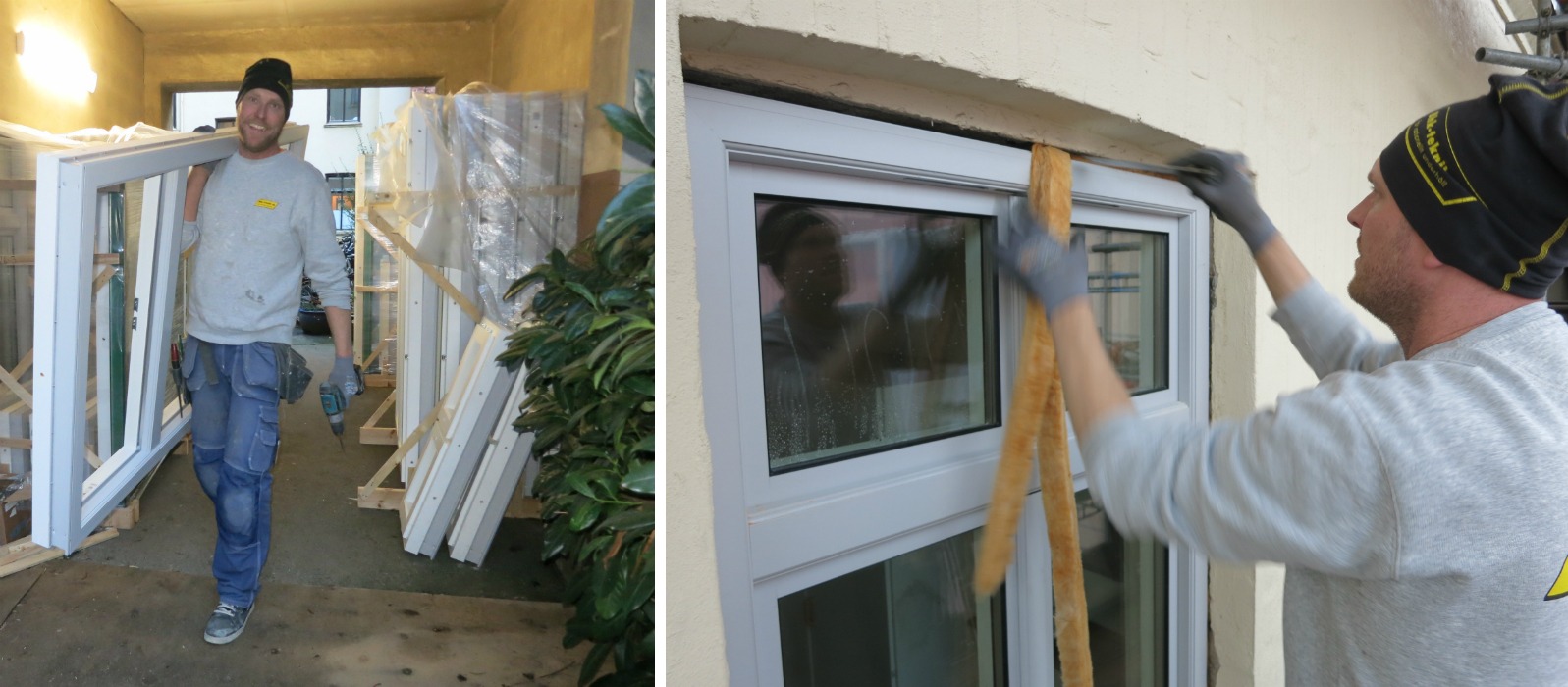 Fönsterbyte med LEAB:s linje ”Epok”. Fönstren drevades enligt SNIRI:s rekommendationer med mineralull, bottningslist, diffusionstät fog samt nya invändiga smyglister i vitmålat trä.