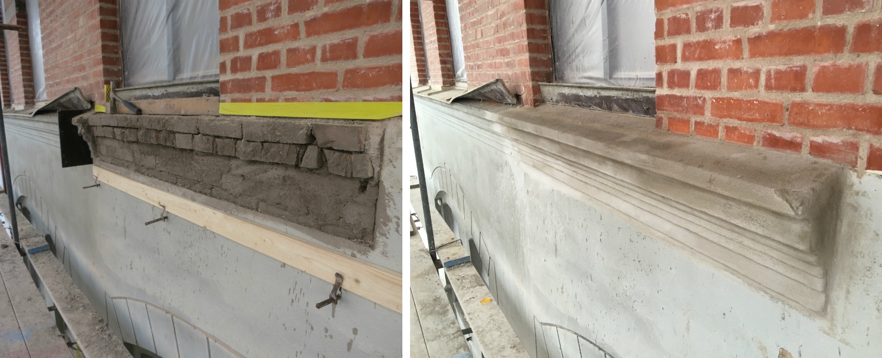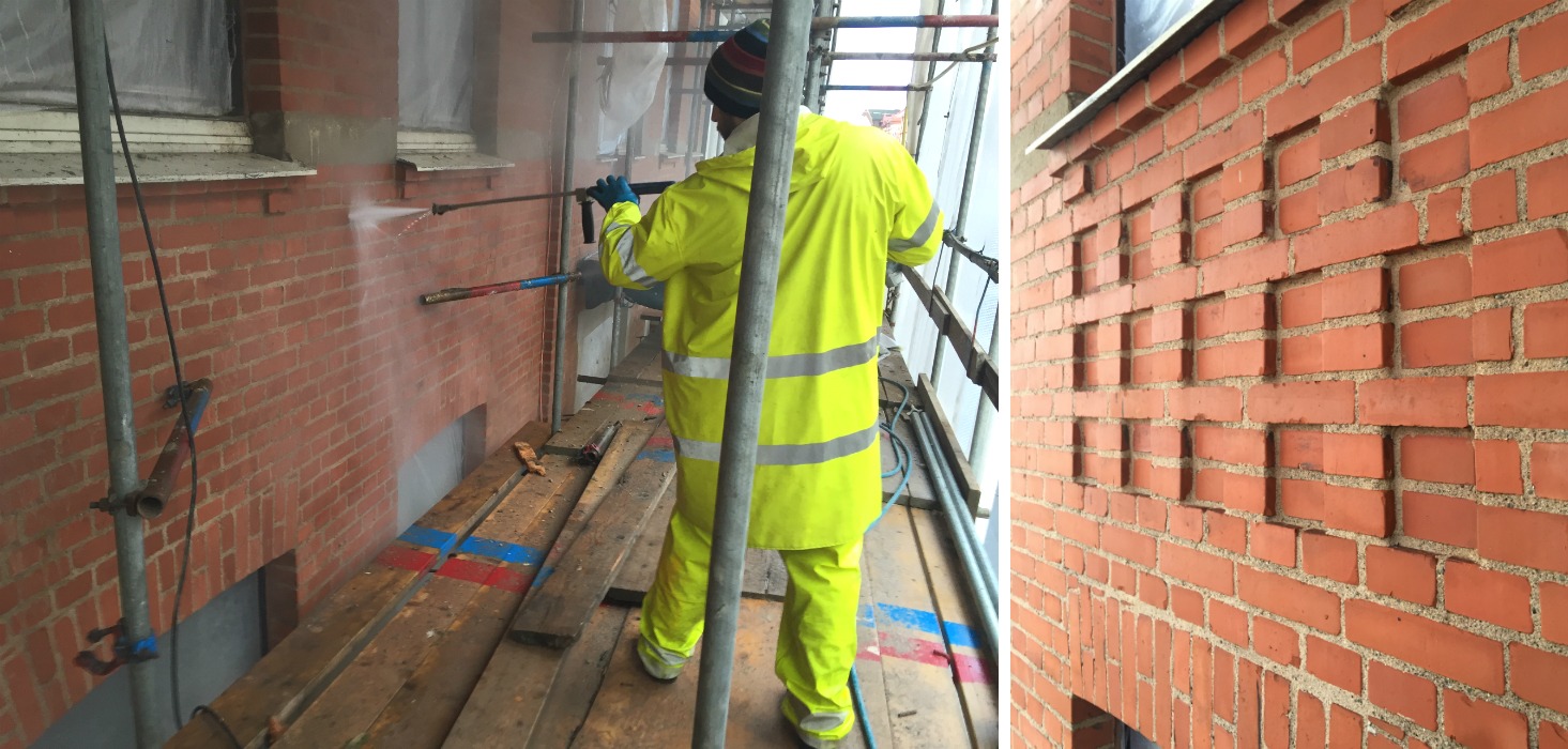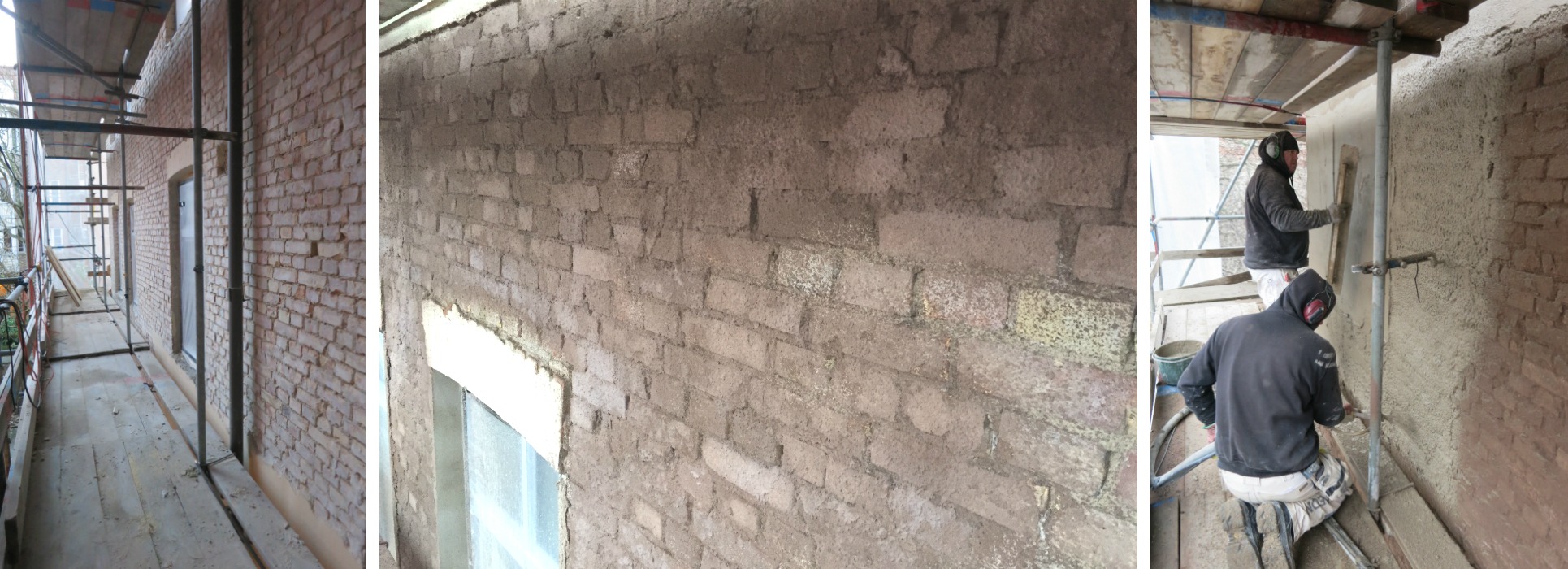 Putsen på en av innergårdarna var slut mycket på grund av en för tät fasadfärg. Putsen revs till putsbäraren (tegelmuren) och teglet grundades med ett hårt bruk i stil med KC-A eller KC-B som ger bra vidhäftning. Sedan gjordes en utstockning med en brädriven yta.