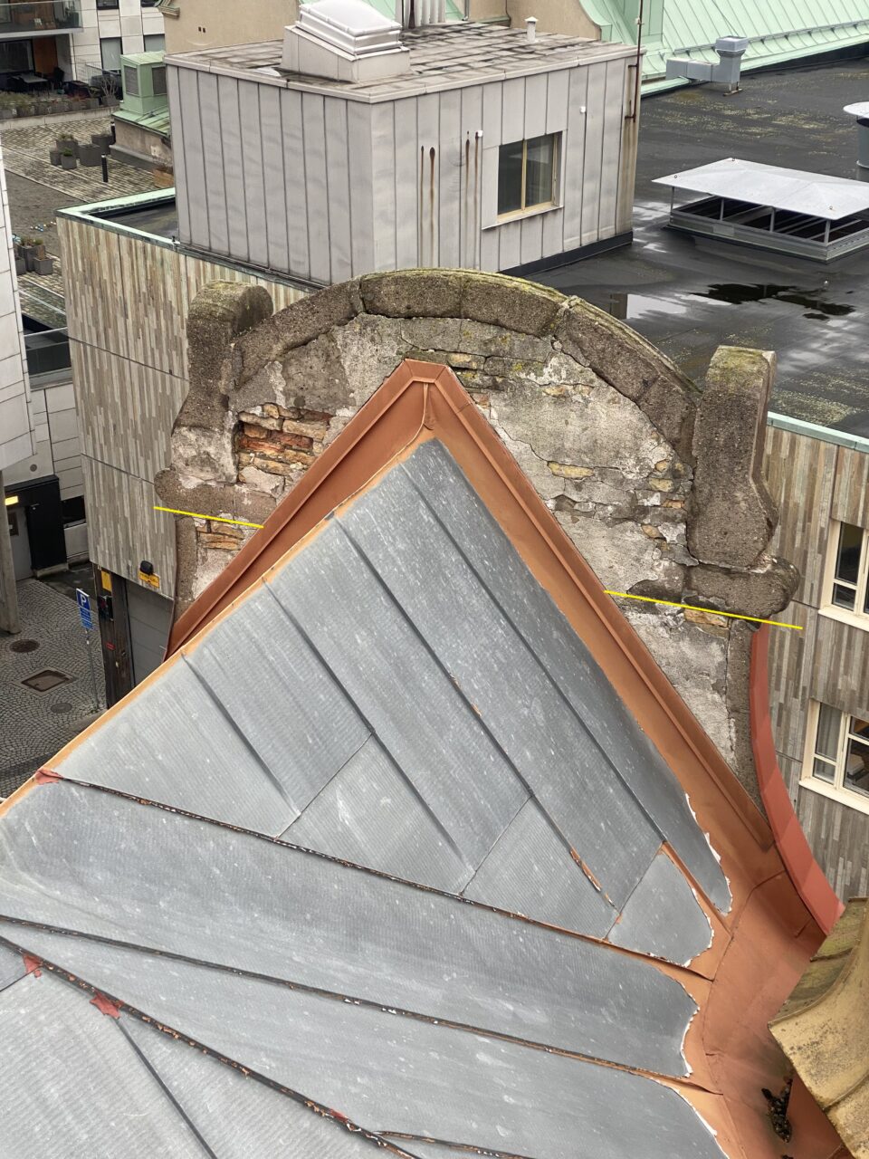 Morneon Fasad kommer att ansvara för att på ett säkert och kontrollerat sätt demontera dessa två fronterspiser. Med tanke på den potentiella rasrisken och vikten av att inte skada vare sig fasaden i övrigt eller de demonterade delarna, kommer arbetet att utföras med hjälp av kran. Detta möjliggör en precis och säker hantering av de tunga och potentiellt instabila elementen.